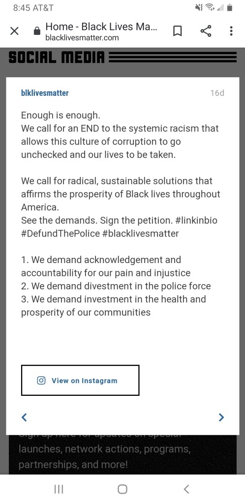 A demand is an insistent and peremptory request, made as if by right. Below is a screenshot of the Black Lives Matter movement website: